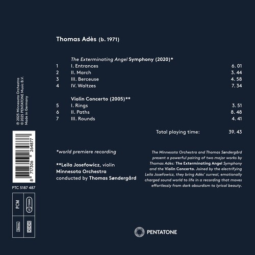 The Minnesota Orchestra and it's music director Thomas Sondergard delve into the imaginative world of Thomas Ades, a singular voice in contemporary classical music. Featuring two of his most compelling orchestral works, The Exterminating Angel Symphony - a world premiere recording - and the Violin Concerto, this album captures Ades' uncanny ability to merge intellectual rigor with raw emotional immediacy. With orchestral textures both radiant and unsettling, Ades evokes a surreal musical landscape, brought vividly to life by Sondergard's incisive direction and violinist Leila Josefowicz's electrifying performance.