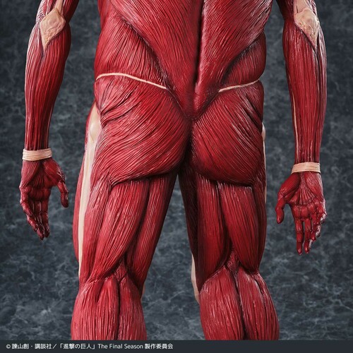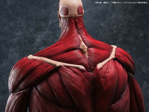 In the play, the huge body that appeared from behind the 50-meter wall was three-dimensional with a total height of 63 centimeters. The muscle fibers of the whole body are reproduced with precise molding befitting this scale, and the unique proportions such as heavy legs, a massive torso, arms that look slender in contrast, and a small head that is conscious of perspective when looking up emphasize the "enormity".