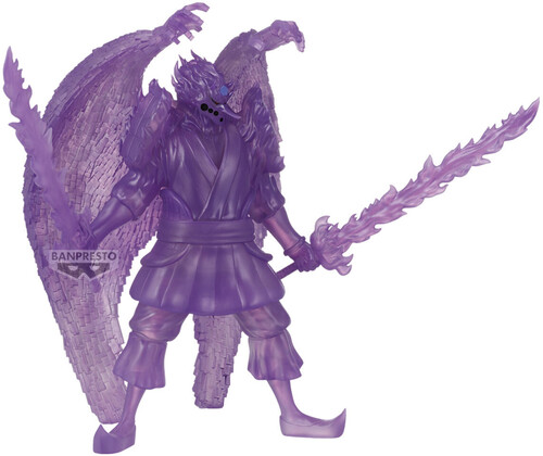 This figure features a translucent purple effect that mimics the ethereal, chakra-based appearance of the ultimate manifestation of the Mangekyō Sharingan eye power. It is sculpted in a dynamic, action-ready stance, legs braced, with twin jagged swords drawn and large, textured wings spread behind its back, giving it a sense of overwhelming power.
