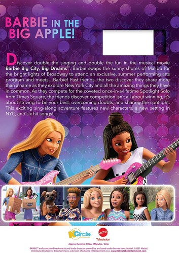 Discover double the singing and double the fun in the all-new musical movie Barbie Big City, Big Dreams. Barbie swaps the sunny shores of Malibu for the bright lights of Broadway to attend an exclusive, summer performing arts program and meets…Barbie! Fast friends, the two discover they share more than a name as they explore New York City and all the amazing things they have in common. As they compete for the coveted once-in-a-lifetime Spotlight Solo from Times Square, the friends discover competition isn’t all about winning, it’s about striving to be your best, overcoming doubts, and sharing the spotlight. This exciting new sing-along adventure features new characters, a new setting in NYC, and six all-new songs!