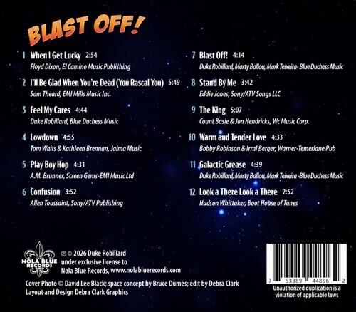 Blast Off! By Duke Robillard and His All Star Band - BLAST OFF! #on an out of this world musical odyssey covering a variety of material from blues to jazz to funky R&B. For his new album, Blast Off! #with Duke Robillard and His All-Star Band, the guitar maestro has assembled a varied but mostly very traditional collection of many of the styles he's known for, including blues, swing, jazz, and R&B. This diversity represents his multi-faceted career and devotion to preserving these roots music styles. The twelve-track album contains three originals, including two instrumentals and an exciting piece concurrently historic and new, the first recording of a blues composition written by Robillard at the age of 17. He is joined on the project by Chris Cote on guitar and vocals, Bruce Bears on keyboards, bassist Marty Ballou and drummer Mark Teixeira. Doug James and Mark Earley are on sax, Jeff "Doc" Chanonhouse, trumpet on "You Rascal You," with special guest Billy Novick on clarinet and alto sax.