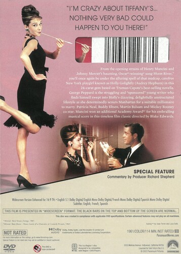 Winner of two Oscars, here's the romantic comedy that sparkles like diamonds! From the opening strains of Henry Mancini and Johnny Mercer's haunting, Oscar-winning song "Moon River," you'll once again be under the alluring spell of that madcap, carefree New York playgirl known as Holly Golightly (Audrey Hepburn) in this 24-carat romantic comedy based on Truman Capote's best-selling novella. George Peppard is the struggling and "sponsored" young writer who finds himself swept into Holly's dizzying, delightfully unstructured lifestyle as she determinedly scours Manhattan for a suitable millionaire to marry. The sparkling special features on this Anniversary Edition DVD only add to the luster of director Blake Edwards' timeless film classic. Patricia Neal, Buddy Ebsen, Martin Balsam and Mickey Rooney co-star; Mancini won an additional Academy Award for his enthralling musical score.