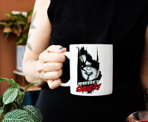 Now is your chance to look evil in the eye and tell it that you're not afraid. The knife-wielding slasher breaks through the door on this mug, paying homage to Stanley Kubrick's The Shining with a referential "Heeere's Chucky!"