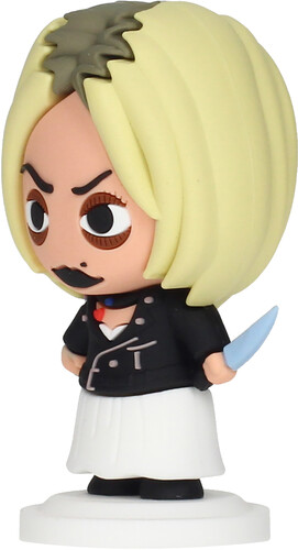 The bride of the infamous killer doll, Tiffany, comes in a 3 in. rubber figure, dressed in her iconic black wedding attire. This figure captures Tiffany’s essence as Chucky’s perfect counterpart, referencing their peculiar and terrifying love story since Bride of Chucky.