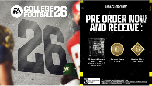 Pre-order* EA SPORTS™ College Football 26 today and receive: College Ultimate Team™ All Hands Pack (Choice of 1 out of 2 items), Dynasty Coach Points, Road to Glory Skill Points