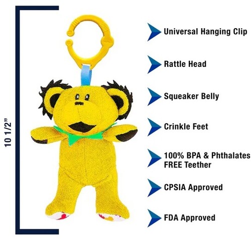 Inspired by the classic, peace-loving band, this adorable bear features a soft terry cloth body with a rattling head, squeaking belly, and crinkle paper feet. Also included is a convenient clip that does double duty as a teether!