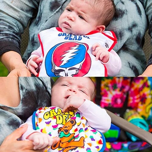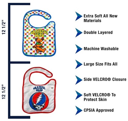 Keep the next generation of Deadheads clean with this Grateful Dead Bibs 2 Pack set from Daphyl’s, featuring imagery of Grateful Dead Dancing Bears and Steal your Face Logos.