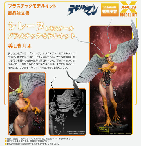 The beautiful high-ranking demon, Sirene, has been brought to life in a plastic model kit. Her sleek proportions, as well as her large bird-of-prey wings and delicately sculpted limbs, have been recreated. The ecstatic expression on her face as she holds the head of a low-ranking demon in her hand is truly like the beauty of a bewitching bird.