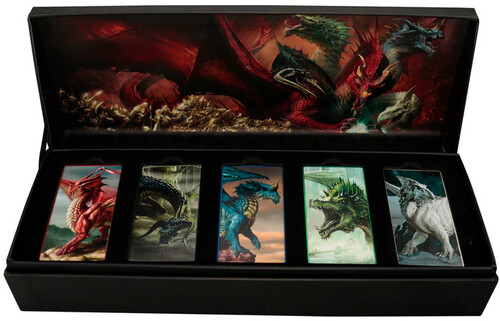Chromatic Dragons were a type of dragon known throughout Faerûn for their distinctive solid-colour scales, and five of the more common ones are presented here in a set of coloured ingots. Limited to 1,974 worldwide (celebrating 50 years of Dungeons & Dragons), the set is individually numbered and presented in a display box.