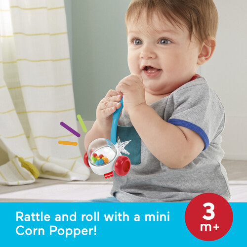 - Corn Popper Rattle has colorful beads that rattle around when baby shakes it, plus free-rolling wheels and a chewy handle for teething play (3M+)