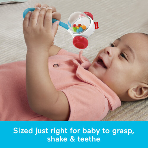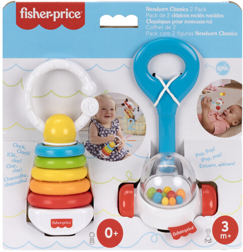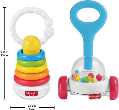 The Fisher-Price Corn Popper Rattle takes everyone’s favorite push toy and sizes it just right for small hands to grasp, shake, and teethe for engaging newborn sensory play. The Fisher-Price Rock-A-Stack Clacker takes the iconic ring-stacking toy and reimagines it as a 5-inch rattle for little hands to grasp, shake, and clack.