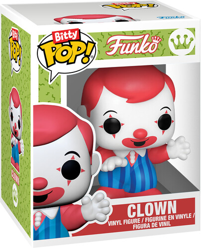 Bitty POP! figure is packaged in a hard acrylic display case with a detachable bottom lid. The detachable bottom lid doubles as an acrylic base, to which the Bitty POP! figure is adhered. Remove Bitty POP! Clown from his display case so he can step inside the Bitty POP! Town Funhouse or ride the moving Bitty POP! Town Spinning Wheel!