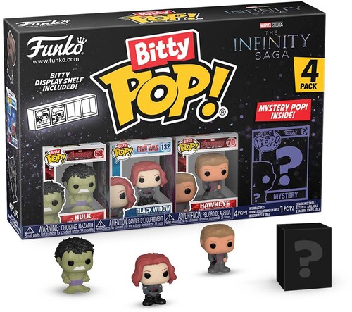 Your favorite Marvel Studios Pops! have been shrunk into Bitty Pops! Expand your Marvel collection with this assortment of Bitty Pop! figures featuring your most beloved super heroes! This 4-pack includes Bitty Pop! Hulk, Bitty Pop! Black Widow, Bitty Pop! Hawkeye, and a mystery Bitty Pop! figure. The possible mystery Bitty Pops! are Rare (1/3) Iron Man, Rare (1/3) Captain America, Hyper Rare (1/6) Doctor Strange, and Hyper Rare (1/6) Scarlet Witch. Bitty Pops! are packaged in hard acrylic cases with detachable bottom lids. Detachable bottom lids double as acrylic bases, to which the Bitty Pop! figures are adhered. Sort and arrange your Bitty Pops! with the included display case! Acrylic display cases are stackable and hold four Bitty Pop! figures each. Vinyl collectibles are approximately 0.9-inches tall. Four figures per single package purchase. Warning: Choking Hazard. Collectibles are small. Not for children under the age of 3 years old. Item selection is random, as each piece is in blind packaging. We cannot accept requests for specific items. You may receive duplicate figures.