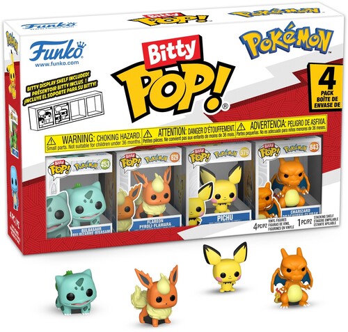 Your favorite Pokémon Pops! have been shrunk into Bitty Pops! Expand your collection with this assortment of Bitty Pop! figures featuring your most beloved Pokémon as miniaturized figures! This 4-pack includes Bitty Pop! Eevee, Bitty Pop! Vaporeon, Bitty Pop! Flareon, and Bitty Pop! Jolteon. Bitty Pops! are packaged in hard acrylic cases with detachable bottom lids. Detachable bottom lids double as acrylic bases, to which the Bitty Pop! figures are adhered. Sort and arrange your Bitty Pops! with the included display case! Acrylic display cases are stackable and hold four Bitty Pop! figures each. Vinyl figures are approximately 0.9-inches tall. Four figures per single package purchase. Warning: Choking Hazard. Collectibles are small. Not for children under the age of 3 years old.
