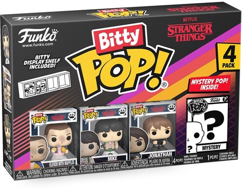 Your favorite Stranger Things Pops! have been shrunk into Bitty Pops! Expand your collection with this assortment of Bitty Pop! figures featuring your most beloved heroes and monsters as miniaturized figures! This 4-pack includes Bitty Pop! Eleven with Eggos, Bitty Pop! Mike, Bitty Pop! Jonathan, and a mystery Bitty Pop! figure. The possible mystery Bitty Pops! are Hyper Rare (1/6) Upside Down Barb, Hyper Rare (1/6) Eleven Underwater, Rare (1/3) Upside Down Will, and Rare (1/3) Eleven with Eggos and Wig. Bitty Pops! are packaged in hard acrylic cases with detachable bottom lids. Detachable bottom lids double as acrylic bases, to which the Bitty Pop! figures are adhered. Sort and arrange your Bitty Pops! with the included display case! Acrylic display cases are stackable and hold four Bitty Pop! figures each. Vinyl figures are approximately 0.9-inches tall. Four figures per single package purchase. Warning: Choking Hazard. Collectibles are small. Not for children under the age of 3 years old. Item selection is random, as each piece is in blind packaging. We cannot accept requests for specific items. You may receive duplicate figures.