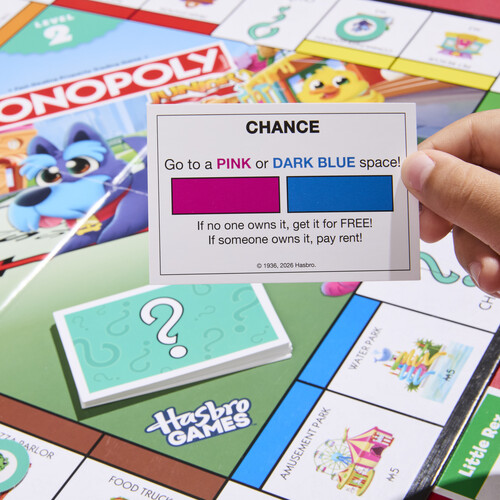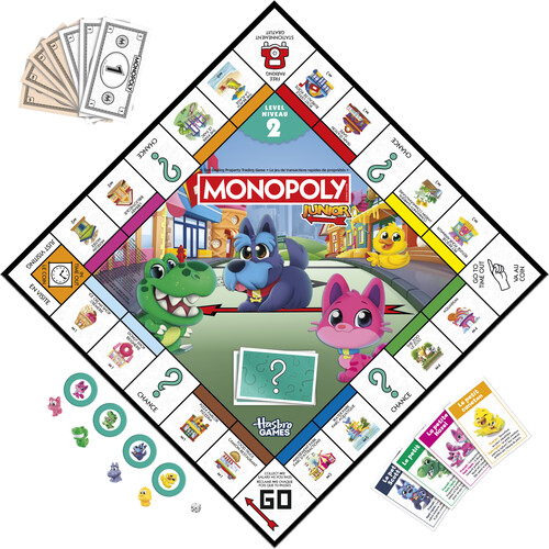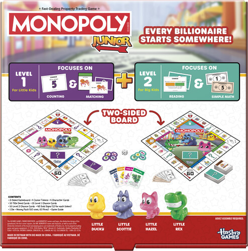 Every billionaire starts somewhere! This 2-in-1 Monopoly Junior game for kids features a double-sided board and 2 levels of difficulty, so families can decide which level is best for them.