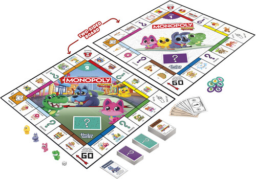 - 2-GAMES-IN-1 MONOPOLY GAME: This Monopoly Junior board game for kids is the little earner game that grows with your child! It includes a double-sided board for 2 Monopoly games and 2 levels of play