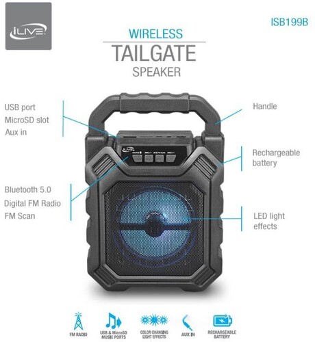 iLive ISB199B Bluetooth Tailgate Party Speaker FM Radio Recha able (Black)