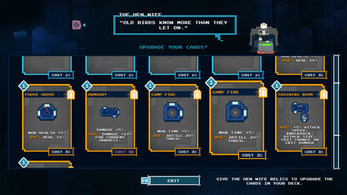 Earn favors from the Harvest Maiden, find Relics to trade with the Hen Wife and Wulver to upgrade and curate your deck, and hope you are strong enough to face The Warden when you can finally reach it.