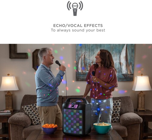 A high-quality microphone with Echo Effect and cable are included so your Karaoke competitions sound like big-budget productions! For ultimate convenience, the optical input allows you to stream Karaoke videos from your smart TV through the Party Rocker™ Max so you have a real Karaoke experience. With back-lit buttons so you can easily see in the dark, and a Boom Button™️ to instantly crank up the bass, volume, and light effects you will always be ready for any event.