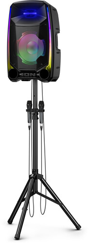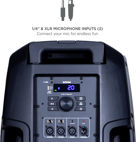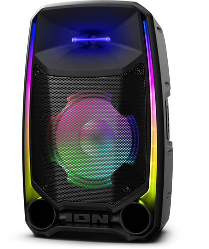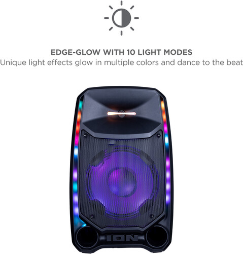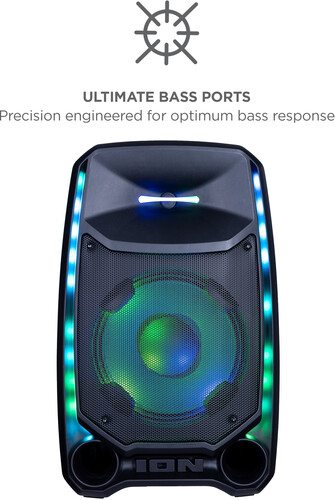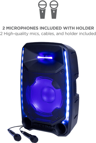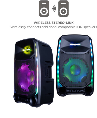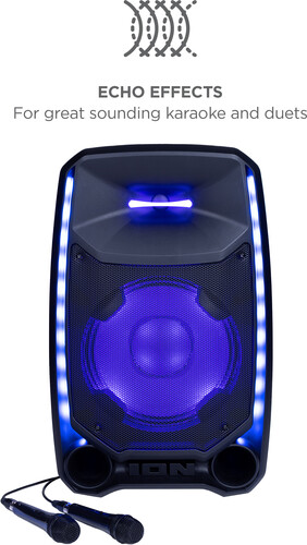 This is the ultimate party speaker! The Total PA™ Ultimate wireless speaker has ION’s new Edge Glow technology with 10 separate light modes that produce unique lighting effects in multiple colors and the lighting will dance in sync to the beat of your music choices! Total PA™️ Ultimate features ION Audio's Sonic Wide Audio™️, the new, innovative technology purposefully designed to provide premium sound to the front, left, and right of the speaker. To immediately enhance and customize your sound, the One-Touch User Interface provides a simple control knob for all sound adjustments. You can also wirelessly connect a second Total PA™️ Ultimate speaker via ION's Stereo-Link™️ technology feature. You can also download the ION Sound Control™ app to control the audio and lighting of your new Total PA™ Ultimate. This powerful Bluetooth® speaker is perfect for Karaoke. Just connect the two included microphones and harmonize your voices together. The microphone inputs have voice echo effects built-in making for perfect vocal duets.