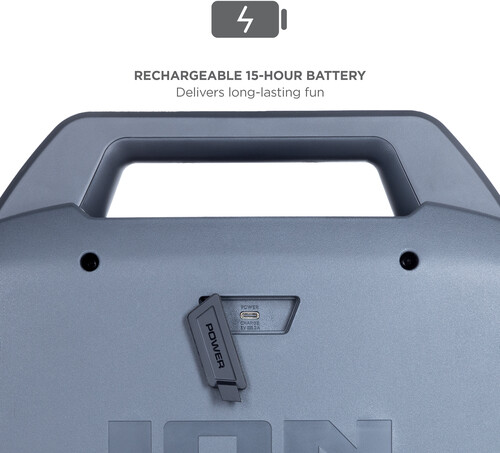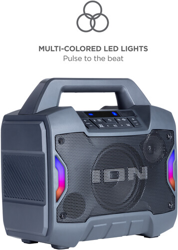 The speaker has multi-colored LED lights on the front and the lighting can pulse to the music for exciting visual effects. You can stream music from any Bluetooth®-enabled device, and there is a long-life rechargeable LI-Ion battery. The new ION Sound Control™ app available via download, lets you control the audio and lighting functions from your mobile device.
