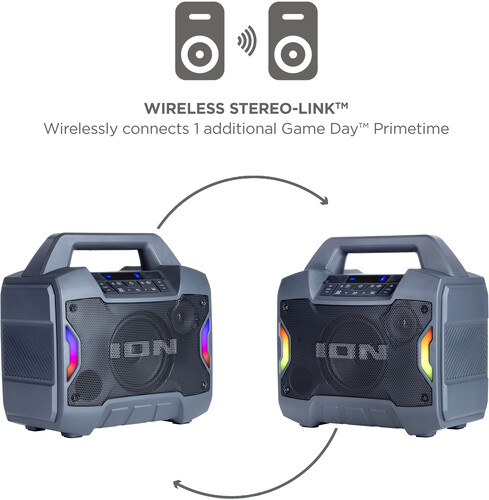 Portability and Convenience Combines in This Powerful Indoor/Outdoor Portable Speaker. It is the time to meet ION Audio’s newest Game Day speaker, Game Day™ Primetime. This powerful new Game Day™ wireless speaker from ION Audio is the loudest Game Day speaker yet. The Game Day™ Prime time is a completely new wireless speaker design with portability and convenience built into it. The Game Day™ Primetime wireless speaker features a LI-Ion battery and makes it easy to have great audio or music wherever you nee