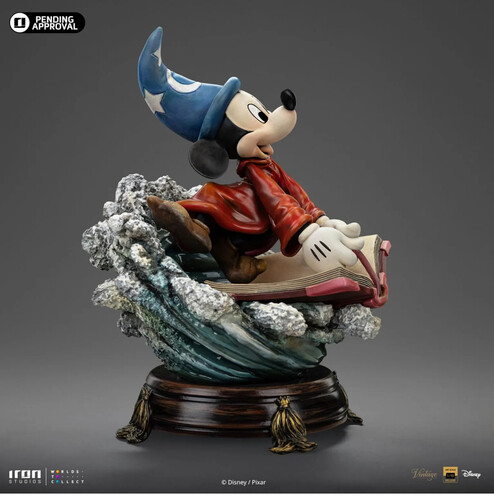 This statue immortalizes one of the most iconic moments from the sequence, depicting Mickey clinging to the Sorcerer’s grimoire as a wave sweeps him away. Mickey wears his red apprentice robe, cinched with a rope belt, along with simple brown shoes. On his head, he wears the Sorcerer’s hat, the source of the magic that spirals out of control. Despite being carried away by the wave, Mickey retains his adventurous spirit and boundless joy, perfectly captured by his countenance. This magnificent collectible is the "Sorcerer Mickey – Disney Classics – Vintage Collection" statue by Iron Studios, set on a base featuring the enchanted brooms, animated by Mickey’s spell.
