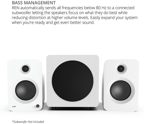 - SEAMLESS USBWOOFER INTEGRATION - When a subwoofer is connected to REN’s sub output, the system automatically redirects all frequencies below 80 Hz to the subwoofer. This allows the main speakers to concentrate on mid and high frequencies, minimizing distortion at higher volume levels.