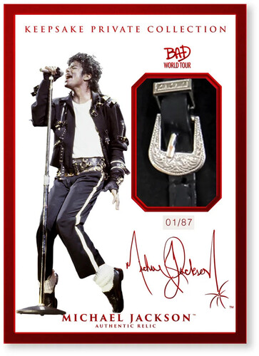 This one-of-a-kind collection will feature Private Collection relic cards containing actual pieces from a pair of Michael Jackson’s Bad World Tour–worn gloves purchased by Keepsake at auction.