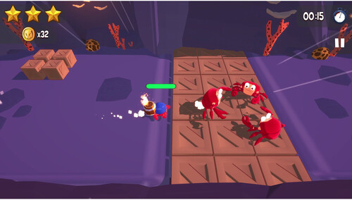 Little kraken in danger! Dive headfirst into this 3D action/racing game, run at full speed, jump to avoid dangers and hit the finish line! Help Voulpy in his adventure! His little brother has been kidnapped and it's up to you to travel through various worlds to find him! Beaches, jungles, snowy mountains, flaming dungeons - you won't be short of challenges, but be careful not to end up as crab bait... To become the coolest kraken on the islands, the game has a multitude of costumes to unlock, pirate or unicorn - it's up to you to choose. So if you love octopuses, the beach, and adventure, set out on an adventure in Kraken Odyssey!
