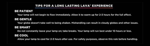 5. Do not set up your lamp in areas that may get too hot or cold such as near heating or AC vents or in a window in colder areas. Unnecessary hot or cold areas can contribute to the cloudy issue with your Lava Lamp.