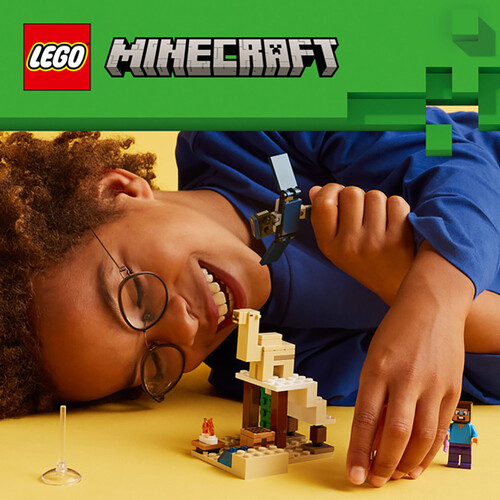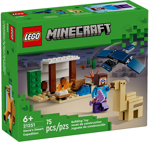 This LEGO® Minecraft® toy for players aged 6+ is the first building toy for kids located in the Minecraft desert biome. Steve's Desert Expedition (21251) challenges kids to build a Minecraft house in a hostile environment, then defend it against attack from the flying Phantom. This reconfigurable role-play gift for boys and girls 6 years old and up features 3 LEGO Minecraft figures, including Steve, plus a Minecraft hut in the desert biome. The set includes iconic Minecraft elements, such as a crafting table, campfire and various pieces of desert scenery. A great gift for any fan of Minecraft, the set inspires creative adventures and battle action when a flying Phantom with movable wings swoops down to attack the base. The toy also features an updated facial expression for Steve and the first appearance of a Baby Camel in a LEGO Minecraft set. This gift idea for kids and gamers is compatible with other LEGO Minecraft playsets (sold separately).