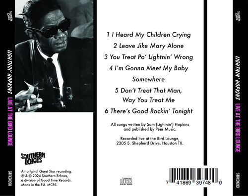 This album of Sam "Lightnin" Hopkins is unique in many ways. It is a well known fact that this artist has been recorded many times - all excellent as only he could be. However, in the past, Lightnin's recording sessions have been planned and ended up "studio dates". With this album, we took recording equipment to a night club ("The Bird Lounge") in Houston, Texas where he was performing live as a club entertainer. By doing this, we captured a Lightnin' seldom heard before. The songs, stories, and feeling is spontaneous, alive and real. We head this unusual artist in his natural surroundings which give a realism of his kind of music - down-home, heartfelt blues.