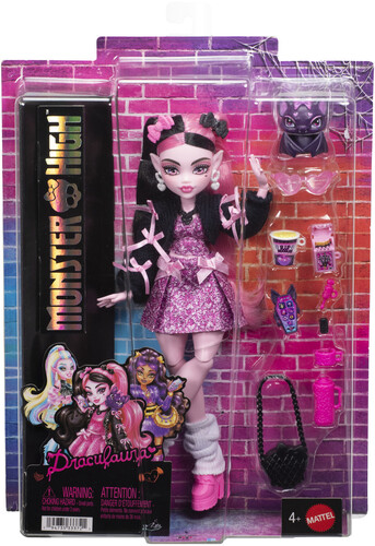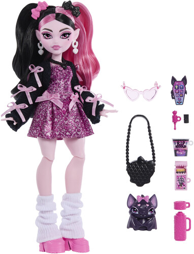 - Draculaura doll also comes with styling and storytelling accessories: a skullette purse, heart-shaped sunglasses, lipstick, iCoffin phone, hot chocolate thermos, RIP ramen and batty treat.