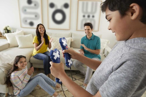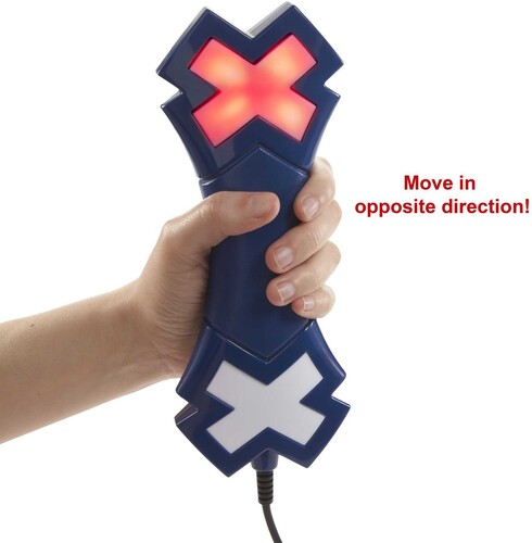 Active play and electronics meet in this exciting game with 4 different game modes. Players must match the patterns by moving the controllers in their hands – if the “arrow” lights up, they move the controller in that direction. If the “X” lights up, they move it in the opposite direction. If they both light up, they must shake the controllers up and down. Sounds and lights speed up as play continues, creating a stimulating experience and increasing difficulty.