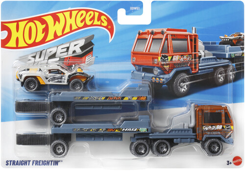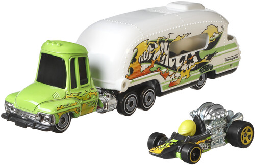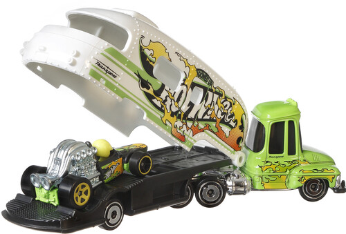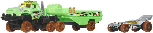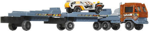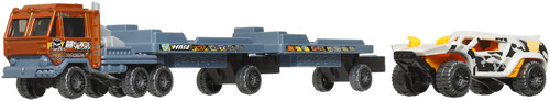 This 1:64 scale set features a hauler and corresponding Hot Wheels car that can be used together for epic storytelling adventures. The car fits in the bed of the transporter so kids can haul their car like a real-life race team. The car is even compatible with Hot Wheels tracks. (Track sold separately.)