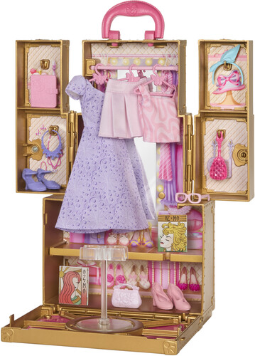 Includes 1 foldable closet, 2 removable outfits, 3 clothes hangers, 2 pair of shoes and 8 fashion accessories.