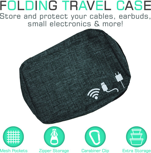 The folding storage case is ideal for traveling, whether for business or pleasure. The practical, space saving design allows for a multitude of storage options. The included pouches and pockets can hold a multitude of cables, earbuds, or accessories and once closed, the exterior will protect your belongings from damage.