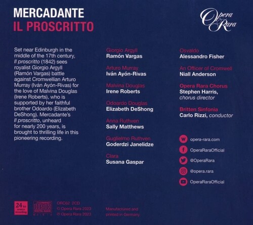 Available for the first time on record, Il proscritto marks Mercadante's return to the bel canto lyricism while retaining the harmonic and orchestra richness found in his "reform" operas. Leading Opera Rara's cast is Mexican tenor Ramón Vargas as Giorgio Argyll, who sings opposite Peruvian tenor Iván Ayón-Rivas, winner of 2021 Operalia competition, as his rival Arturo Murray. Their mutual love interest is Malvina Douglas sung by American mezzo-soprano Irene Roberts. Performing the opera's standout bravura aria, Elizabeth DeShong sings the role of Malvina's brother, Odoardo. The cast is completed by Elizabeth DeShong, Sally Matthews, Goderdzi Janelidze, Susana Gaspar, Niall Anderson and Alessandro Fisher.