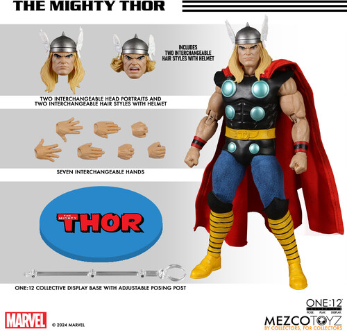 The One:12 Collective The Mighty Thor features two interchangeable head portraits and seven interchangeable hands for recreating dynamic battle scenes. Inspired by his early appearances in Marvel Comics, the God of Thunder is outfitted in a swooping red cape, a black leather-like armored tunic, blue fitted pants, a belt with a “T” insignia, bold yellow boots, and is crowned with his silver winged helmet paired with two interchangeable hair styles.