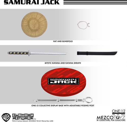 The One:12 Collective Samurai Jack is outfitted in his iconic white gi, geta sandals, a removable hat, and a removable blindfold. 5 head portraits with 3 interchangeable hairstyles allow for a multitude of distinct looks and posing possibilities.