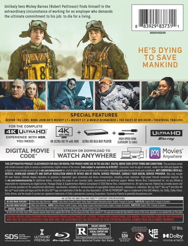 In the future, desperate loser Mickey Barnes (Robert Pattinson) was willing to take any job connected with colonizing a distant planet-including cannon-fodder tasks which, if fatal, his employers would simply clone him and send out a replacement. It worked as well as you could expect, until they generated an 18th Mickey while the 17th was still alive... and protocol mandated that they both had to go. Bong Joon-Ho's dark sci-fi satire co-stars Naomi Ackie, Toni Collette, Steven Yuen, Mark Ruffalo, Holliday Grainger. 137 min. Widescreen; Soundtrack: English.