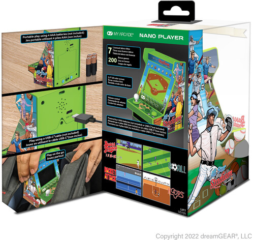 Includes fully playable versions of BASES LOADED™ 1,2,3 & 4, GOAL!™, RACKET ATTACK™ and HOOPS™. The All-Star Stadium Nano Player features a full color 2.4" screen to brightly display all 7 titles and is fine-tuned for hours of play through its emphasis on ergonomics and compact design.