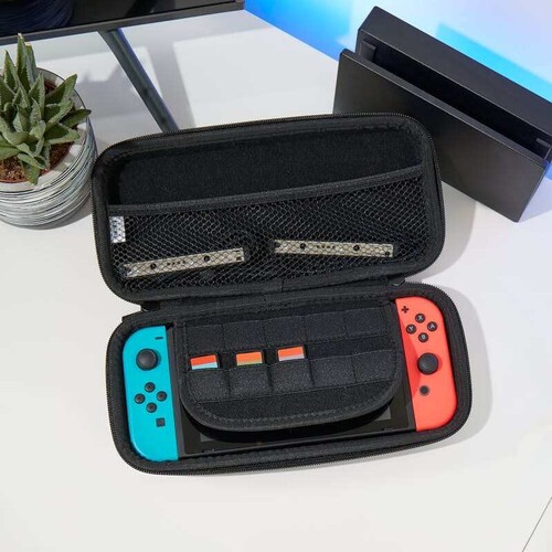 The durable exterior shields your Nintendo Switch from bumps, scratches, and accidental drops, whilst the interior compartment is lined with soft, plush material to further safeguard your console and Joy-Con controllers from scratches and dust. A soft inner flap adds extra protection for the screen along with storage for up to ten Switch games.