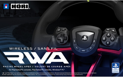 HORI has untethered the top-rated Racing Wheel Apex with the all new Wireless Racing Wheel Apex for PlayStation 5! Wireless technology provides a 32ft range, through the included receiver that plugs directly into your console USB port, to free up all new possibilities for your racing game set up. Charge your wireless racing wheel with the 6.6ft charge cable, that also allows you to play as a wired racing wheel. With onboard controls for navigating menus, paddle shifters to make shifting gears a breeze, and full-size pedals, it has everything you need to race like a pro! The Wireless Racing Wheel Apex clamps securely to your table or racing wheel stand with a sturdy clamp and steel screw pin. Switch from 270 degree to 180 degree turn ratio on the fly and fine tune other settings such as dead zone, pedal sensitivity and more. The future of racing peripherals is here, find it with the all new Wireless Racing Wheel Apex for PlayStation 5, PlayStation 4, and Windows 11/10. Officially licensed by Sony.