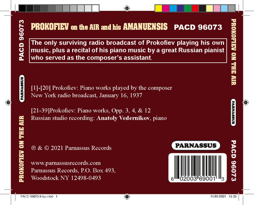 The only surviving radio broadcast of Prokofiev playing his own music, plus a recital of some of his piano music by the great Russian pianist who served as his Ammanuensis