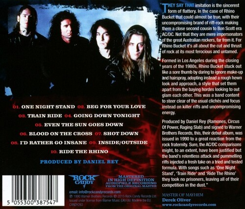 Fully Remastered Audio / AC/DC inspired hard rock classic / Produced by Daniel Rey (Ramones, Circus Of Power, Raging Slab) / Features One Night Stand, Train Ride and Ride The Rhino / 12 page full-colour booklet, 3,500 word essay, new interviews, unpublished photos and enhanced artwork. They say that imitation is the sincerest form of flattery. In the case of Rhino Bucket that could almost be true, with their uncompromising brand of riff-rock making them a close second cousin to Bon Scott era AC/DC. Not that they are mere impersonators of the great Australian rockers, far from it. For Rhino Bucket it's all about the cut and thrust of rock at it's most ferocious and untamed. Formed in Los Angeles during the closing years of the 1980s, Rhino Bucket stuck out like a sore thumb by daring to ignore makeup and hairspray, adopting instead a rough-hewn look and approach, a style that set them apart from the baying hordes looking to out glam each other. This was a band content to steer clear of the usual clichs and focus instead on killer riffs and uncompromising energy. Produced by Daniel Rey (Ramones, Circus Of Power, Raging Slab) and signed to Warner Brothers Records, this, their debut album, was issued in 1990 to a great reaction from the rock fraternity. Sure, the AC/DC comparisons might, to an extent, have been justified but the band's relentless attack and pummelling riffs injected a fresh take on a tried and tested formula. With songs such as One Night Stand, Train Ride and Ride The Rhino they take no prisoners, leaving all of their competition in the dust. Track listing: One Night Stand; Beg For Your Love; Train Ride; Going Down Tonight; Even The Sun Goes Down; Blood On The Cross; Shot Down; I'd Rather Go Insane; Inside/Outside; Ride The Rhino