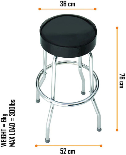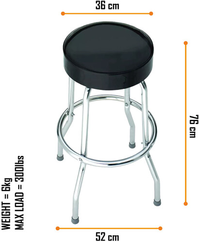 PVC coated sponge seat Swivel top Chrome plated legs Max load (300lbs) - so, Meatloaf proof!
