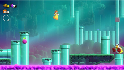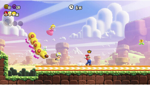 Classic Mario side-scrolling gameplay is turned on it's head with the addition of Wonder Flowers. These game-changing items trigger spectacular moments you have to see to believe... Witness pipes coming alive, float through outer space, wreak havoc as a giant Spike-Ball, and see even more unexpected events called wonder effects. Choose from the largest cast of characters in a side-scrolling Mario game, including Mario, Luigi, Peach, Daisy, and Toads. Players of all skill levels can feel the wonder by playing as a Yoshi or Nabbit who don't take damage! Grab surprising new power-ups like Elephant Fruit to use your trunk to trounce enemies and spray water, on your adventure to save the Flower Kingdom from Bowser's wonder grip. You can even find and equip new badges to change up your play style to truly make this Mario adventure your own. Team up with up to three friends locally* and gather around one Nintendo Switch system to experience the game-bending wonder effects together as you tackle courses as a team and help each other on your way to the Goal Pole. Online*, you can work together or turn a course into a friend race to finish first. Even when playing solo, connecting online let's you see silhouettes of other Mario fans around the world as they embark on their own journeys. See how they approach each course and get their help when you're in trouble. Find standees left by other players to help recover from falls-or place your own.